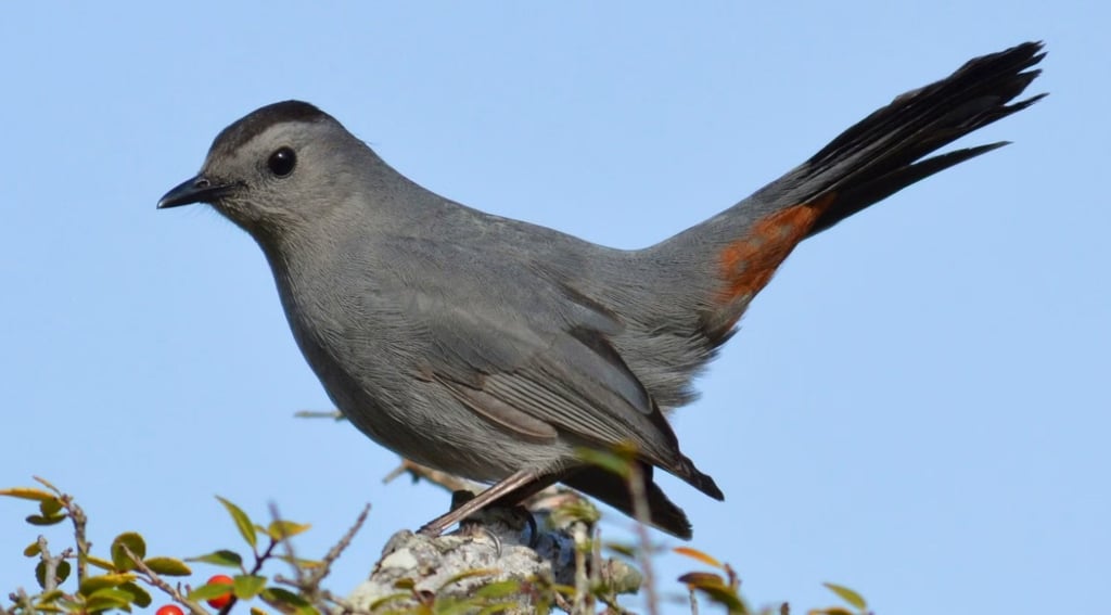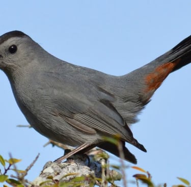 Gray Catbird Description: Medium-sized songbird, smaller than a robin, with a smooth gray body, black cap, and rusty-red under-tail. They sometimes mimic other species in complex, jumbled song. Prefers dense shrubs and small trees in forest edges, streamside thickets, and old fields. Occasionally feeds on suet.